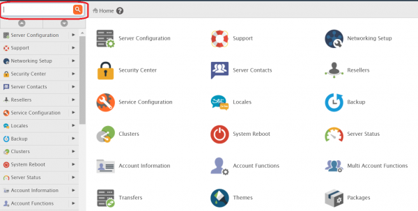 Una volta effettuato il login su WHM, portarsi nel campo di ricerca in alto a sinistra.